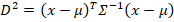 é a inversa da matriz de covariância, que ajusta para correlação e variância.